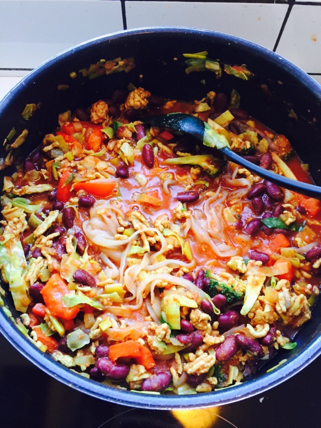 Til denne brugte jeg : olie, karry, chili flager, all round krydderi, stegte det lidt, tilsatte derefter 1 løg, 1 fed hvidløg, og så 1 pk hakket kød, lad det brune, og tilsæt dine shirataki fettucine, og derefter udskåret peberfrugt, kvart spidskål, en gulerod, kvart bundt broccoli, 2 ds røde kidney bønner, skru op for blusset og lad det simre lidt. Derefter hælder du 2-3 ds flåede tomat er i, tilsætter 1 bouillon terning. Og lad det koge lidt op.